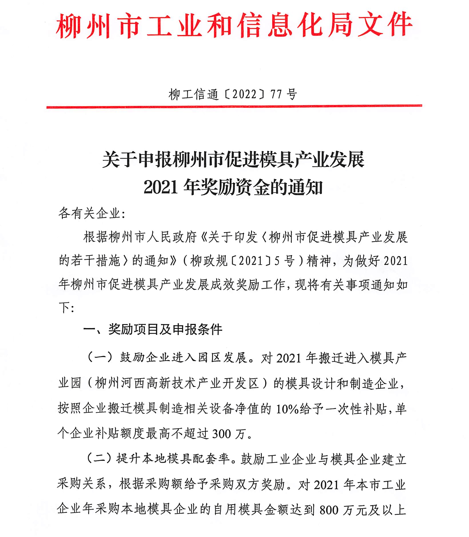 關(guān)于申報(bào)2021年柳州市促進(jìn)模具產(chǎn)業(yè)發(fā)展獎(jiǎng)勵(lì)資金的通知(2022-6-29))
