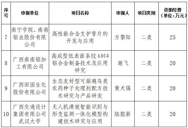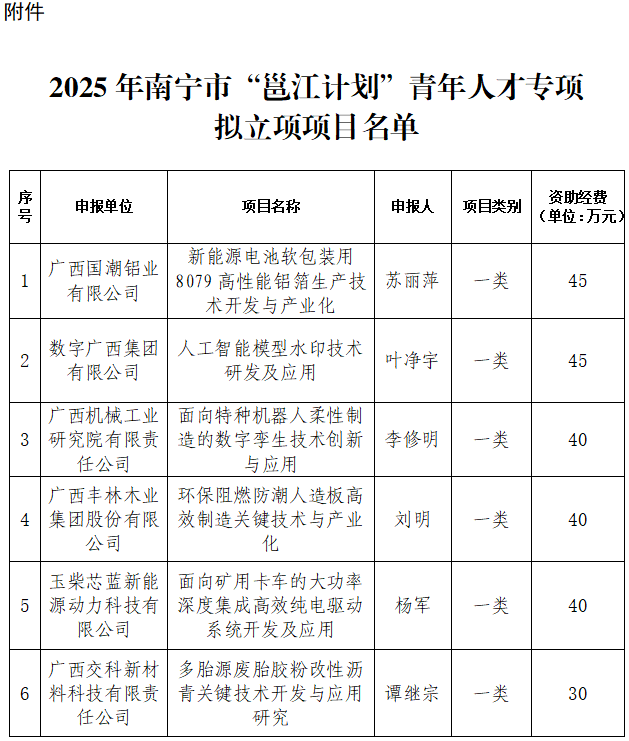 根據(jù)《中共南寧市委員會教育科技人才工作領(lǐng)導(dǎo)小組人才工作專項小組辦公室關(guān)于開展2025年南寧市“邕江計劃”四個專項申報工作的通知》文件要求,我局組織開展了2025年南寧市“邕江計劃”青年人才專項申報工作,經(jīng)企業(yè)申報、資格審查、專家評審、實地調(diào)研、集體審議等程序,現(xiàn)提出2025年南寧市“邕江計劃”青年人才專項擬立項項目10項,擬下達經(jīng)費325萬元?,F(xiàn)將擬立項項目予以公示,公示期:2025年8月27日—9月2日(共5個工作日)。